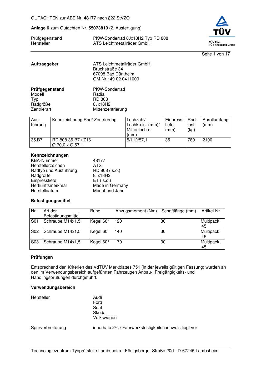Dieses Gutachten (abe) bezieht sich auf die Alufelge ATS RD 808 in der Ausführung 8Jx18 ET 0, Mittenloch 0 mm (KBA 48177). Im PDF findest du typischerweise zulässige Reifengrößen, Auflagen/Anbauhinweise und – je nach Dokument – Hinweise zur Eintragung.