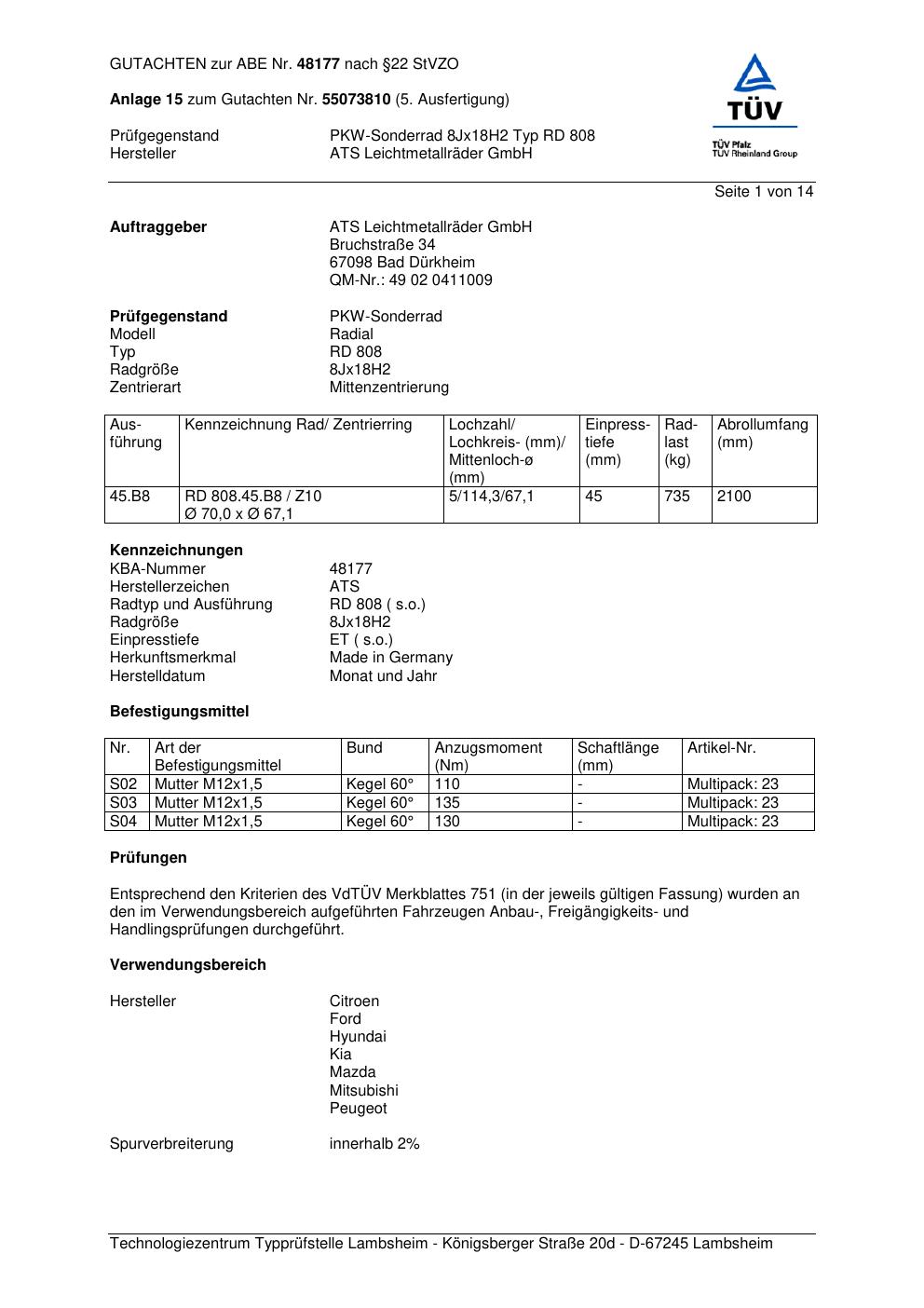 Dieses Gutachten (abe) bezieht sich auf die Alufelge ATS RD 808 in der Ausführung 8Jx18 ET 0, Mittenloch 0 mm (KBA 48177). Im PDF findest du typischerweise zulässige Reifengrößen, Auflagen/Anbauhinweise und – je nach Dokument – Hinweise zur Eintragung.