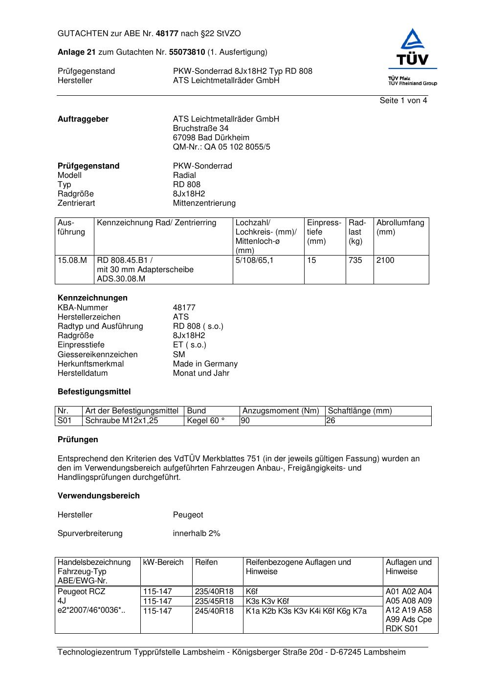 Dieses Gutachten (abe) bezieht sich auf die Alufelge ATS RD 808 in der Ausführung 8Jx18 ET 0, Mittenloch 0 mm (KBA 48177). Im PDF findest du typischerweise zulässige Reifengrößen, Auflagen/Anbauhinweise und – je nach Dokument – Hinweise zur Eintragung.