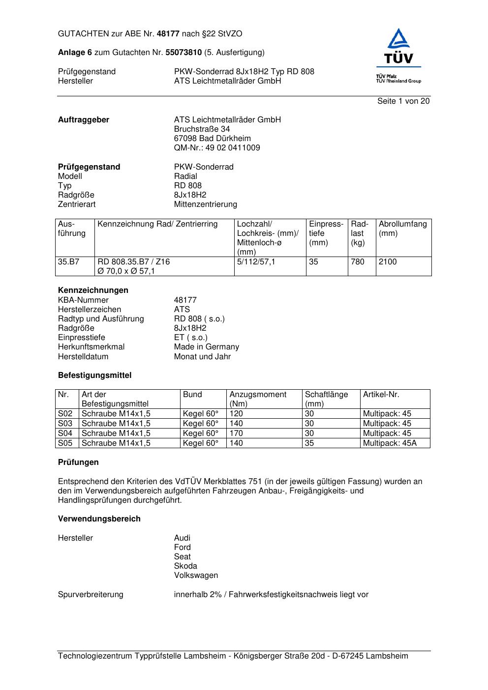 Dieses Gutachten (abe) bezieht sich auf die Alufelge ATS RD 808 in der Ausführung 8Jx18 ET 0, Mittenloch 0 mm (KBA 48177). Im PDF findest du typischerweise zulässige Reifengrößen, Auflagen/Anbauhinweise und – je nach Dokument – Hinweise zur Eintragung.
