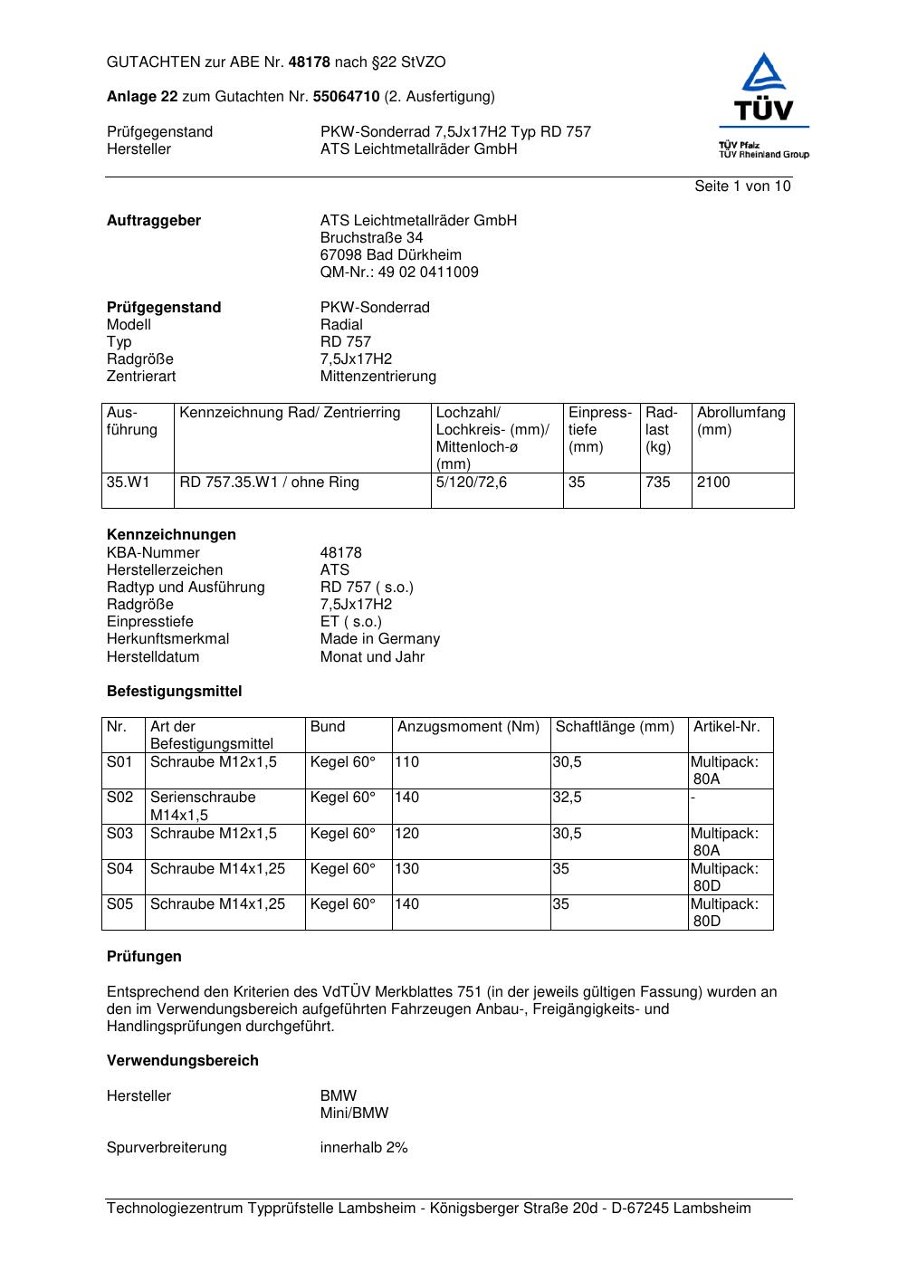 Dieses Gutachten (abe) bezieht sich auf die Alufelge ATS RD 757 in der Ausführung 7.5Jx17 ET 0, Mittenloch 0 mm (KBA 48178). Im PDF findest du typischerweise zulässige Reifengrößen, Auflagen/Anbauhinweise und – je nach Dokument – Hinweise zur Eintragung.