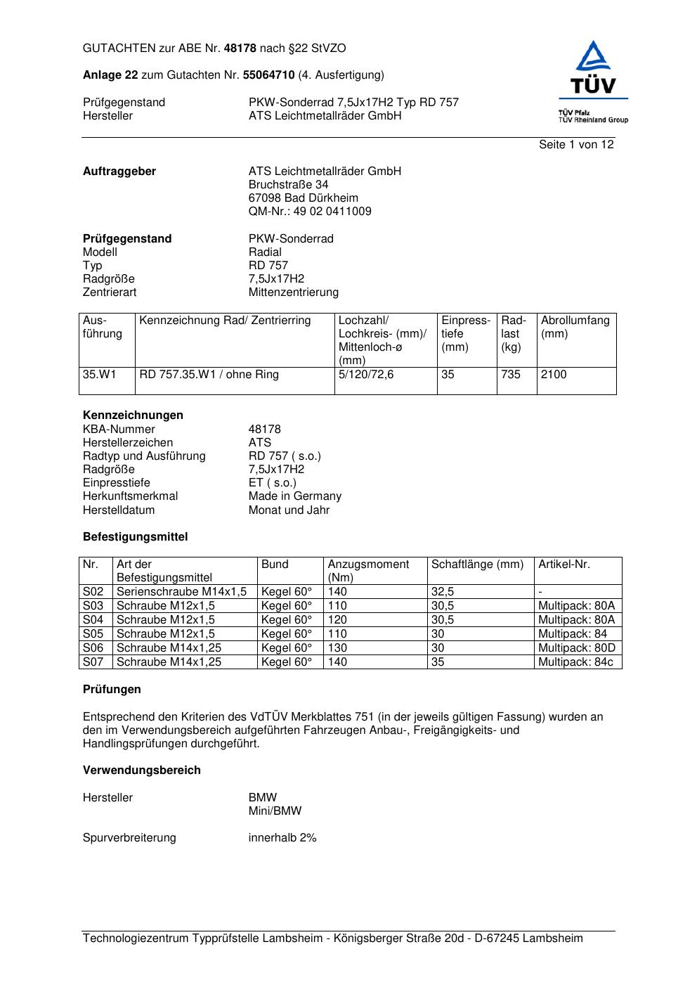 Dieses Gutachten (abe) bezieht sich auf die Alufelge ATS RD 757 in der Ausführung 7.5Jx17 ET 0, Mittenloch 0 mm (KBA 48178). Im PDF findest du typischerweise zulässige Reifengrößen, Auflagen/Anbauhinweise und – je nach Dokument – Hinweise zur Eintragung.