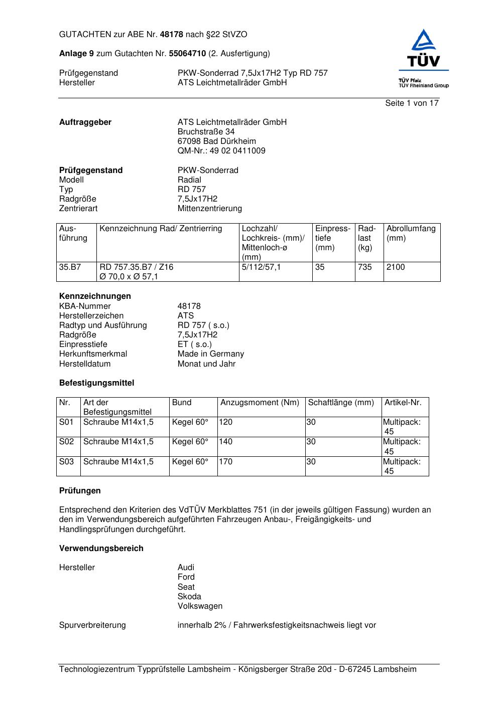 Dieses Gutachten (abe) bezieht sich auf die Alufelge ATS RD 757 in der Ausführung 7.5Jx17 ET 0, Mittenloch 0 mm (KBA 48178). Im PDF findest du typischerweise zulässige Reifengrößen, Auflagen/Anbauhinweise und – je nach Dokument – Hinweise zur Eintragung.