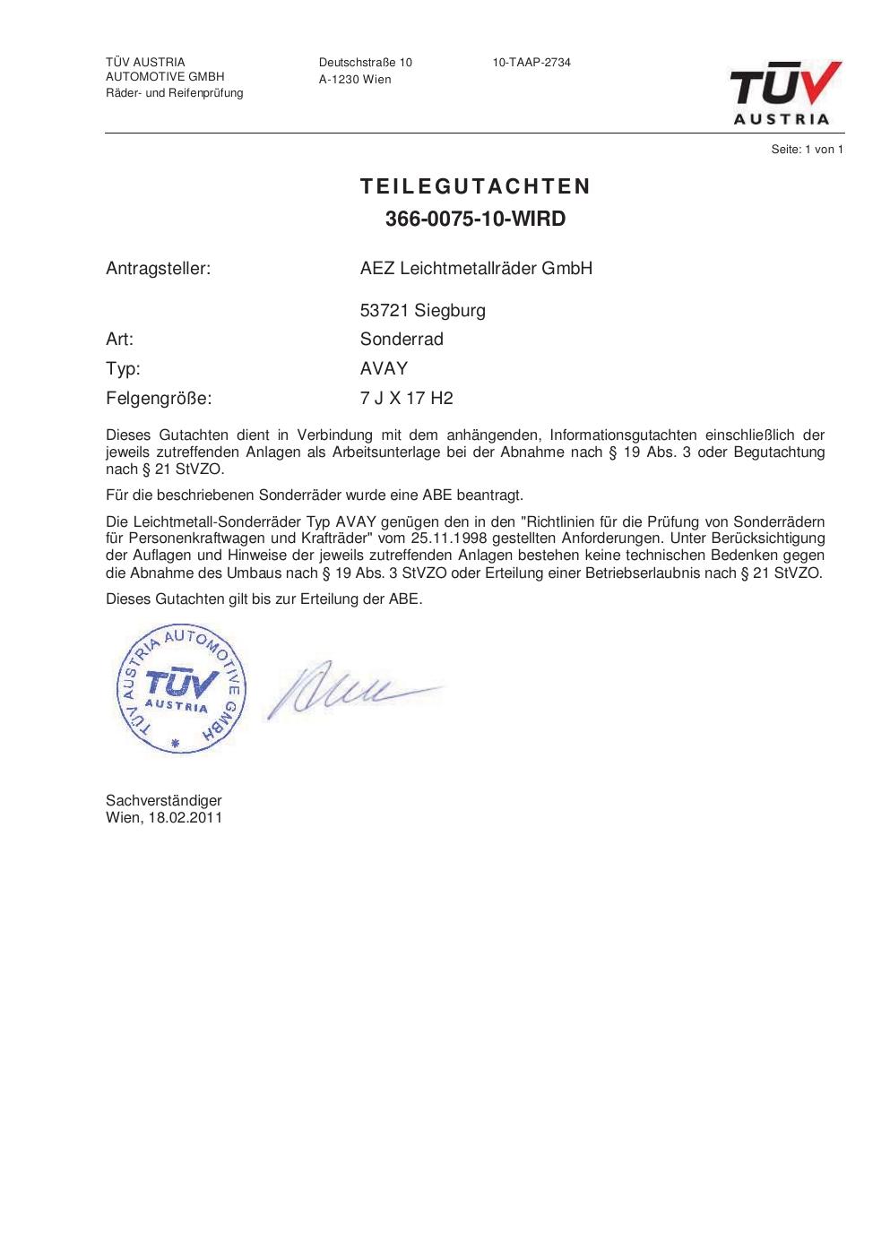 Dieses Gutachten (abe) bezieht sich auf die Alufelge brand-aez AVAY in der Ausführung 7Jx17 ET 0, Mittenloch 0 mm (KBA 48188). Im PDF findest du typischerweise zulässige Reifengrößen, Auflagen/Anbauhinweise und – je nach Dokument – Hinweise zur Eintragung.