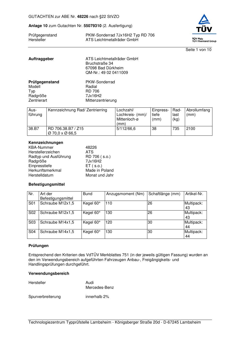 Dieses Gutachten (abe) bezieht sich auf die Alufelge ATS RD 706 in der Ausführung 7Jx16 ET 0, Mittenloch 0 mm (KBA 48226). Im PDF findest du typischerweise zulässige Reifengrößen, Auflagen/Anbauhinweise und – je nach Dokument – Hinweise zur Eintragung.