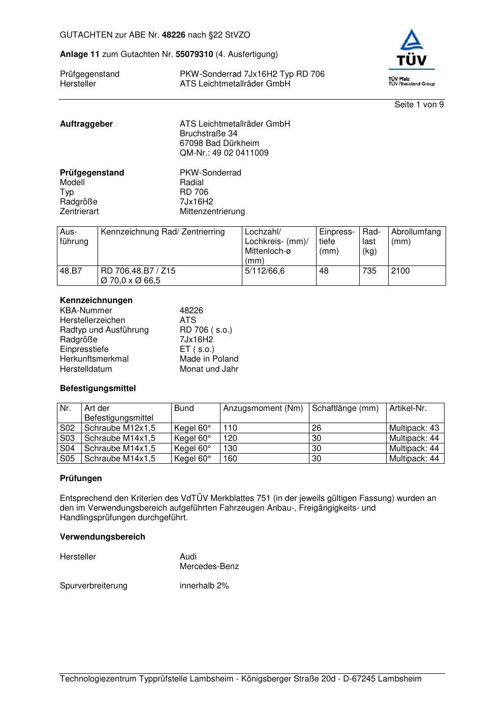 Dieses Gutachten (abe) bezieht sich auf die Alufelge ATS RD 706 in der Ausführung 7Jx16 ET 0, Mittenloch 0 mm (KBA 48226). Im PDF findest du typischerweise zulässige Reifengrößen, Auflagen/Anbauhinweise und – je nach Dokument – Hinweise zur Eintragung.