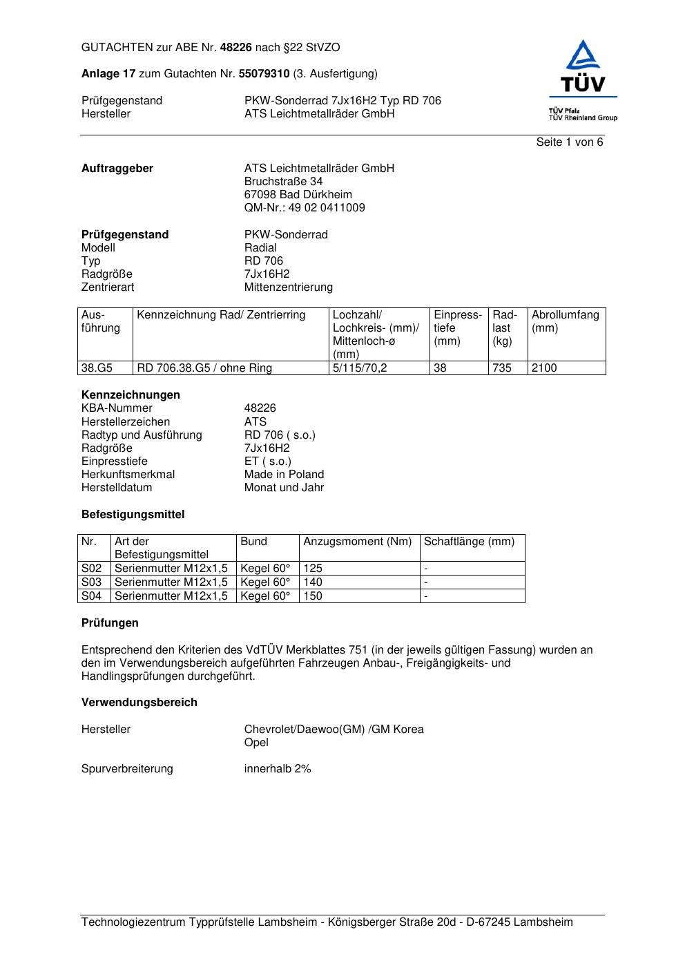 Dieses Gutachten (abe) bezieht sich auf die Alufelge ATS RD 706 in der Ausführung 7Jx16 ET 0, Mittenloch 0 mm (KBA 48226). Im PDF findest du typischerweise zulässige Reifengrößen, Auflagen/Anbauhinweise und – je nach Dokument – Hinweise zur Eintragung.