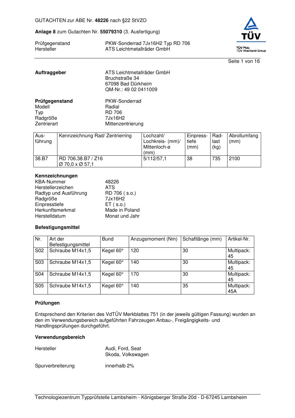 Dieses Gutachten (abe) bezieht sich auf die Alufelge ATS RD 706 in der Ausführung 7Jx16 ET 0, Mittenloch 0 mm (KBA 48226). Im PDF findest du typischerweise zulässige Reifengrößen, Auflagen/Anbauhinweise und – je nach Dokument – Hinweise zur Eintragung.