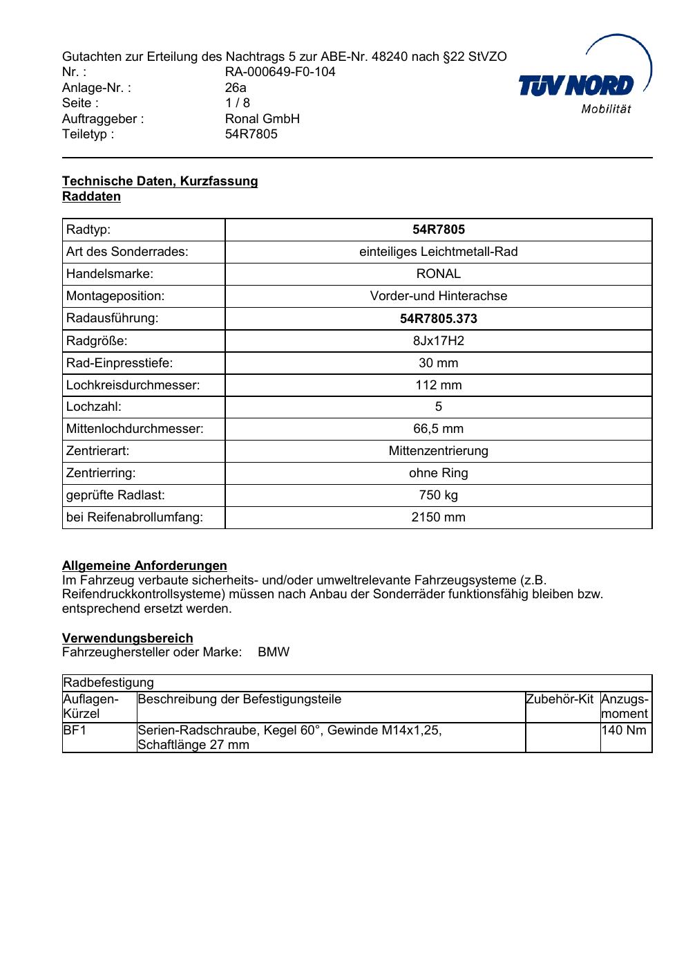 Dieses Gutachten (abe) bezieht sich auf die Alufelge Ronal 54R7805 in der Ausführung 8Jx17 ET 0, Mittenloch 0 mm (KBA 48240). Im PDF findest du typischerweise zulässige Reifengrößen, Auflagen/Anbauhinweise und – je nach Dokument – Hinweise zur Eintragung.