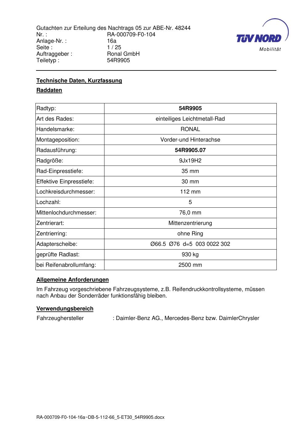 Dieses Gutachten (abe) bezieht sich auf die Alufelge Ronal 54R9905 in der Ausführung 9Jx19 ET 0, Mittenloch 0 mm (KBA 48244). Im PDF findest du typischerweise zulässige Reifengrößen, Auflagen/Anbauhinweise und – je nach Dokument – Hinweise zur Eintragung.