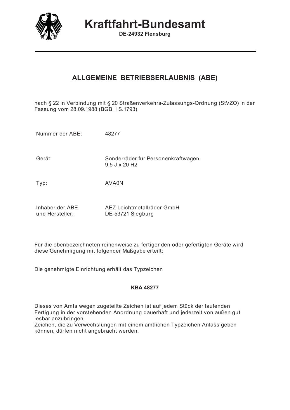 Dieses Gutachten (abe) bezieht sich auf die Alufelge brand-aez AVA0N in der Ausführung 9.5Jx2 ET 0, Mittenloch 0 mm (KBA 48277). Im PDF findest du typischerweise zulässige Reifengrößen, Auflagen/Anbauhinweise und – je nach Dokument – Hinweise zur Eintragung.