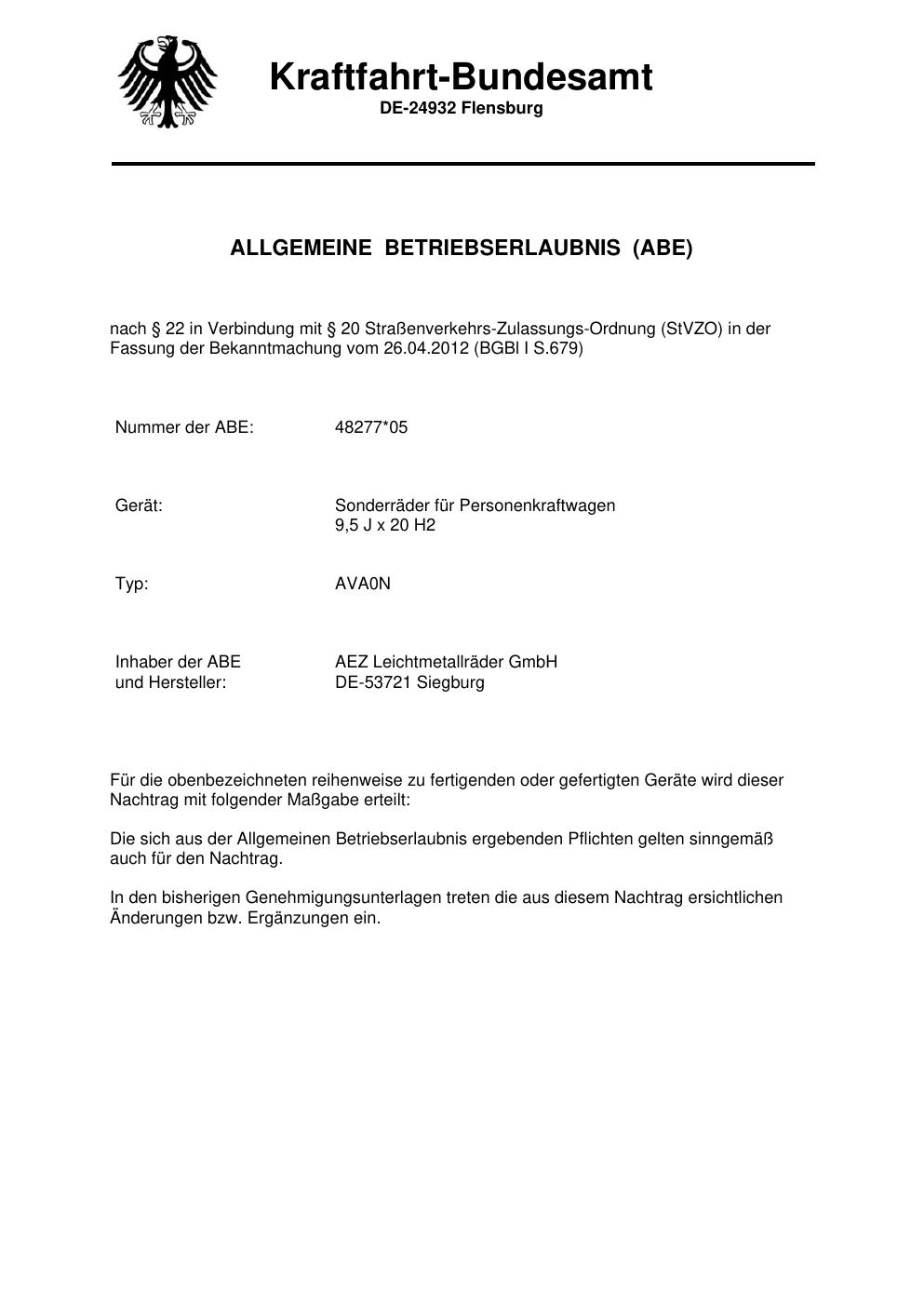 Dieses Gutachten (abe) bezieht sich auf die Alufelge brand-aez AVA0N in der Ausführung 9.5Jx2 ET 0, Mittenloch 0 mm (KBA 48277). Im PDF findest du typischerweise zulässige Reifengrößen, Auflagen/Anbauhinweise und – je nach Dokument – Hinweise zur Eintragung.