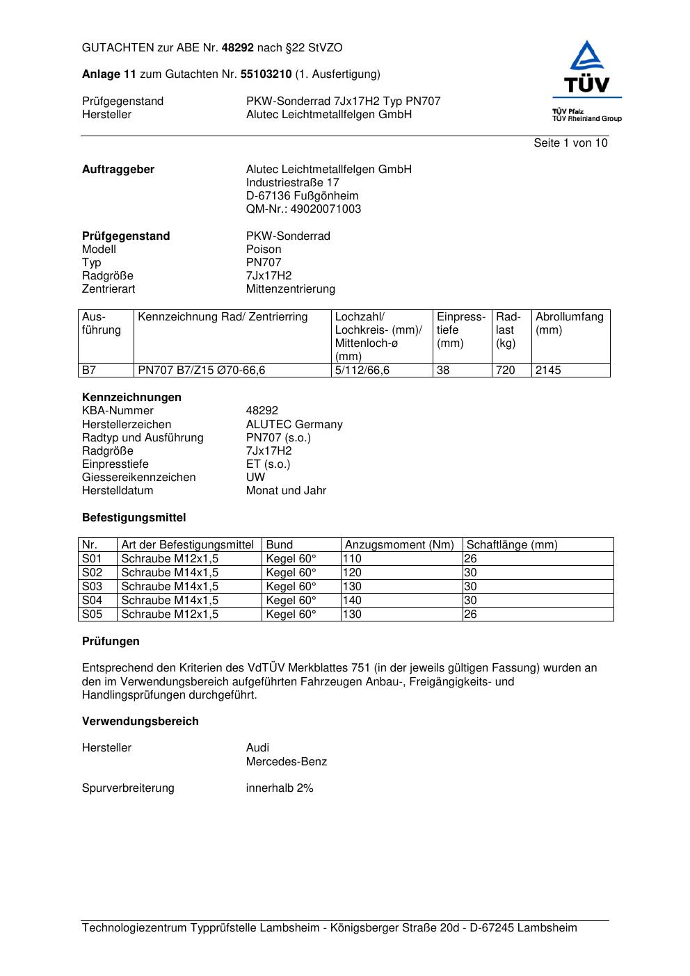 Dieses Gutachten (abe) bezieht sich auf die Alufelge ALUTEC PN707 in der Ausführung 7Jx17 ET 0, Mittenloch 0 mm (KBA 48292). Im PDF findest du typischerweise zulässige Reifengrößen, Auflagen/Anbauhinweise und – je nach Dokument – Hinweise zur Eintragung.