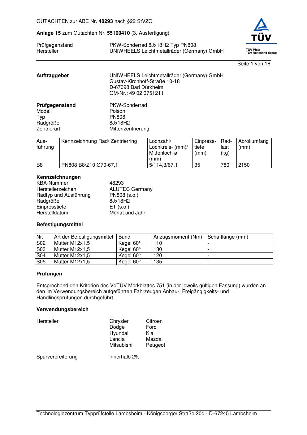 Dieses Gutachten (abe) bezieht sich auf die Alufelge ALUTEC PN808 in der Ausführung 8Jx18 ET 0, Mittenloch 0 mm (KBA 48293). Im PDF findest du typischerweise zulässige Reifengrößen, Auflagen/Anbauhinweise und – je nach Dokument – Hinweise zur Eintragung.