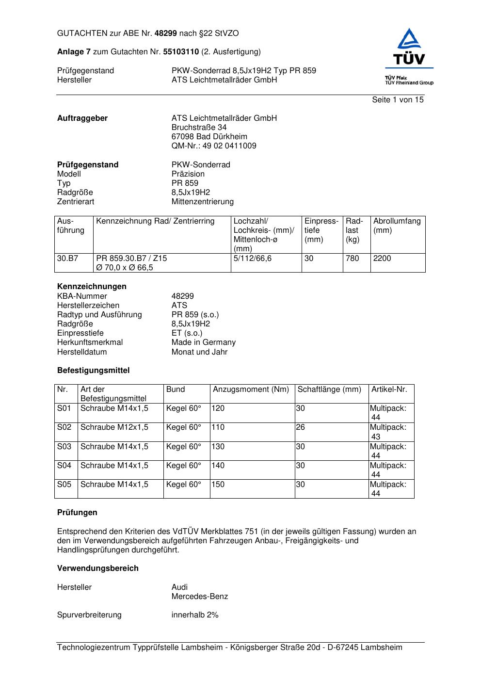 Dieses Gutachten (abe) bezieht sich auf die Alufelge ATS PR 859 in der Ausführung 8.5Jx19 ET 0, Mittenloch 0 mm (KBA 48299). Im PDF findest du typischerweise zulässige Reifengrößen, Auflagen/Anbauhinweise und – je nach Dokument – Hinweise zur Eintragung.