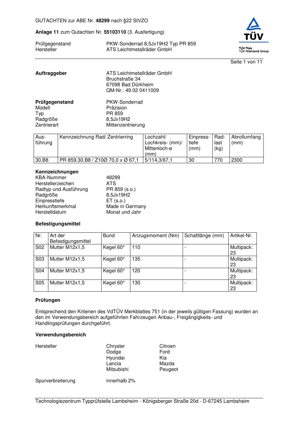 Dieses Gutachten (abe) bezieht sich auf die Alufelge ATS PR 859 in der Ausführung 8.5Jx19 ET 0, Mittenloch 0 mm (KBA 48299). Im PDF findest du typischerweise zulässige Reifengrößen, Auflagen/Anbauhinweise und – je nach Dokument – Hinweise zur Eintragung.