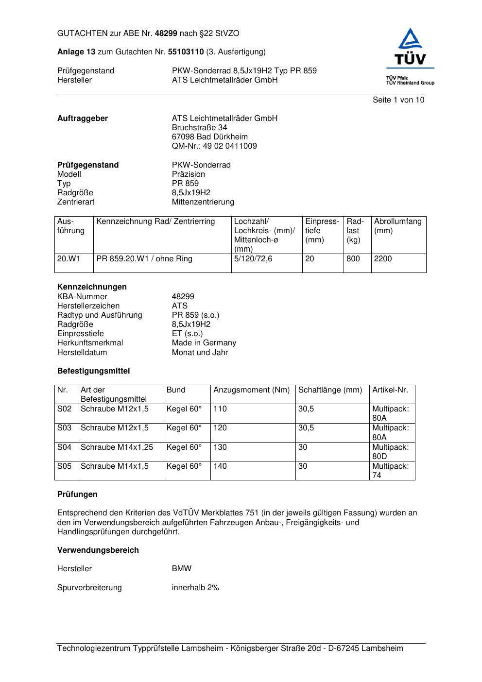 Dieses Gutachten (abe) bezieht sich auf die Alufelge ATS PR 859 in der Ausführung 8.5Jx19 ET 0, Mittenloch 0 mm (KBA 48299). Im PDF findest du typischerweise zulässige Reifengrößen, Auflagen/Anbauhinweise und – je nach Dokument – Hinweise zur Eintragung.