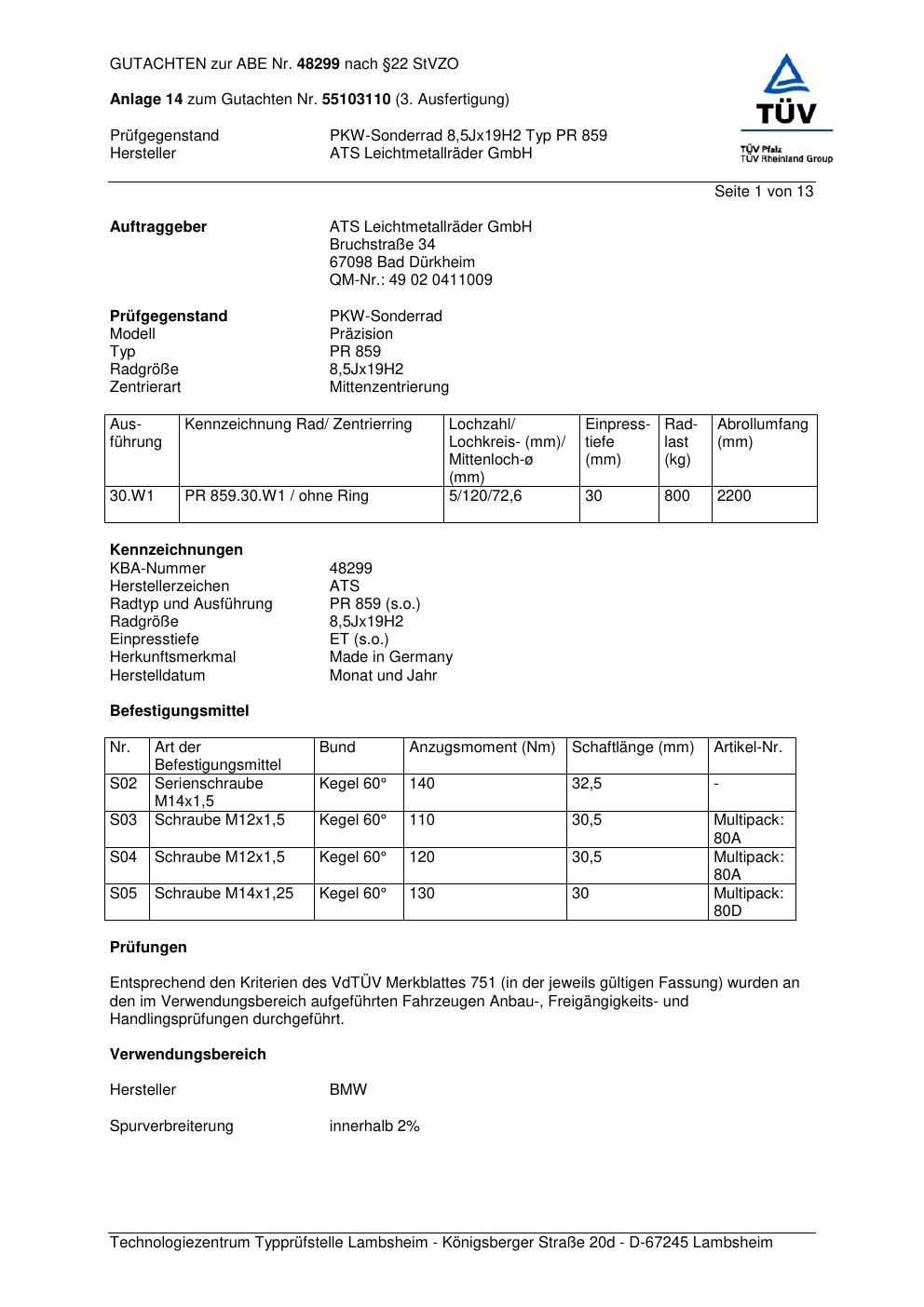Dieses Gutachten (abe) bezieht sich auf die Alufelge ATS PR 859 in der Ausführung 8.5Jx19 ET 0, Mittenloch 0 mm (KBA 48299). Im PDF findest du typischerweise zulässige Reifengrößen, Auflagen/Anbauhinweise und – je nach Dokument – Hinweise zur Eintragung.