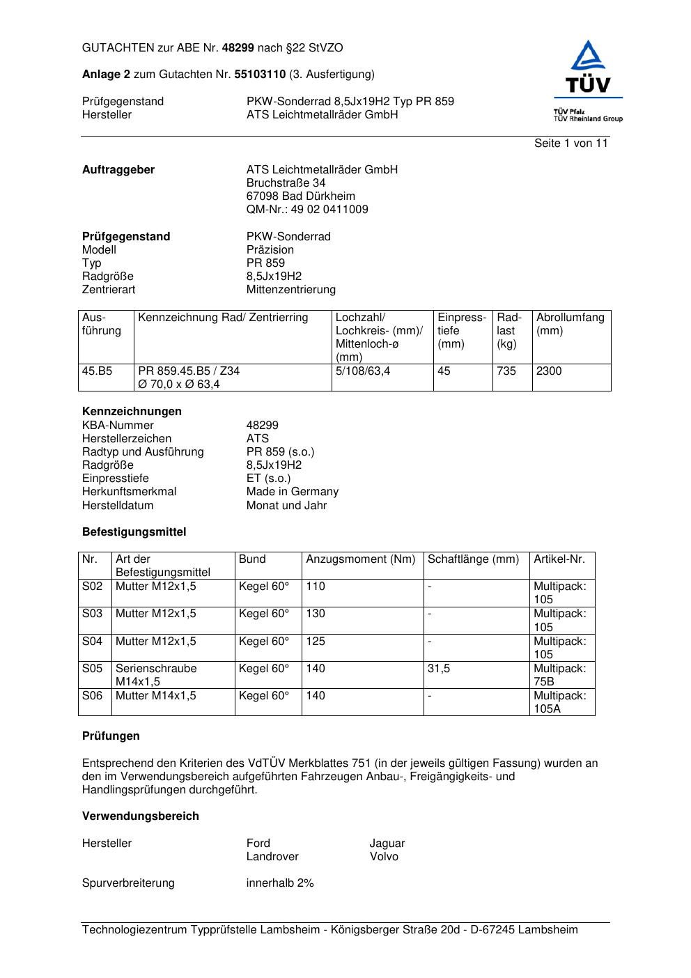 Dieses Gutachten (abe) bezieht sich auf die Alufelge ATS PR 859 in der Ausführung 8.5Jx19 ET 0, Mittenloch 0 mm (KBA 48299). Im PDF findest du typischerweise zulässige Reifengrößen, Auflagen/Anbauhinweise und – je nach Dokument – Hinweise zur Eintragung.