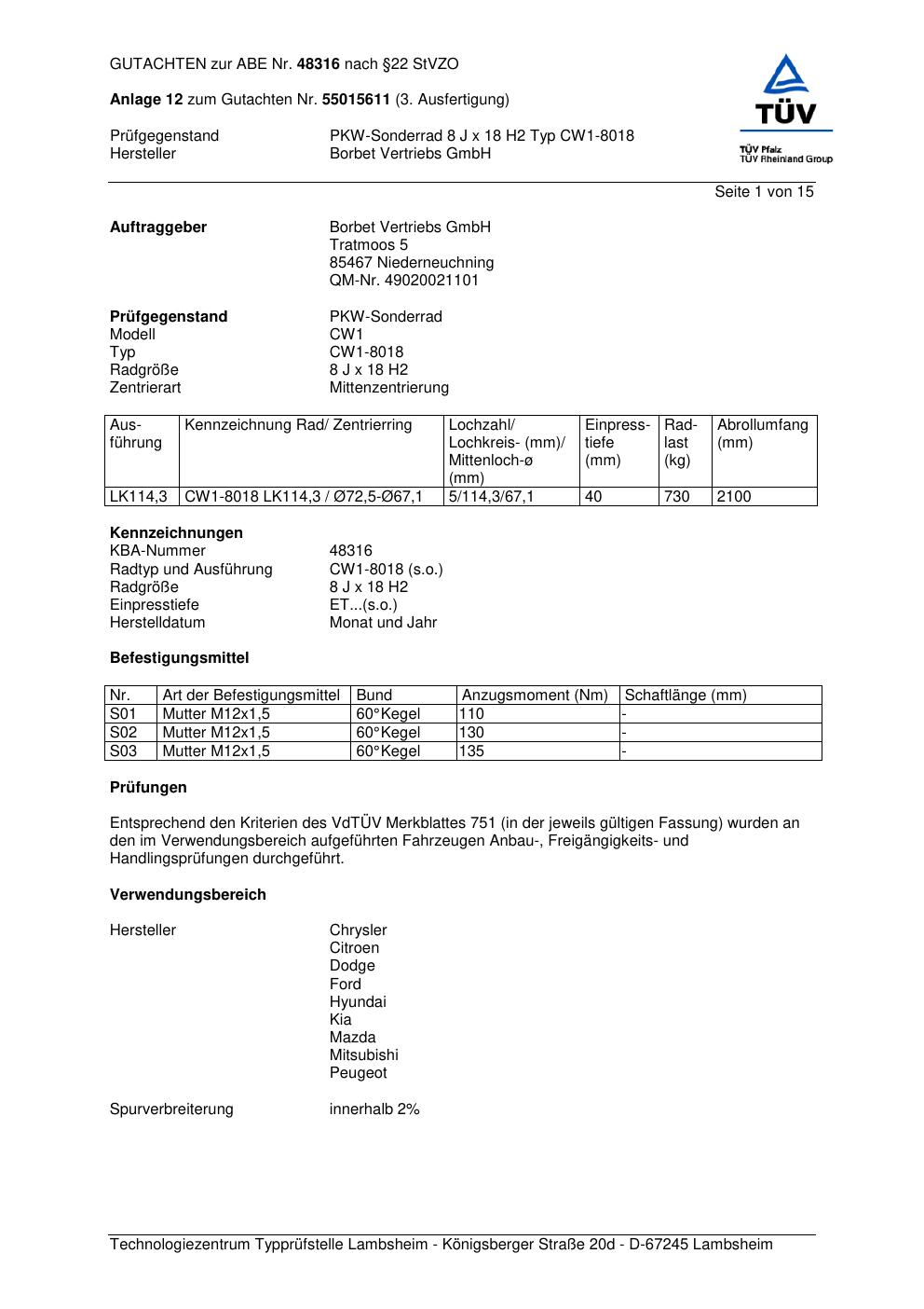 Dieses Gutachten (abe) bezieht sich auf die Alufelge Borbet CW1-80 18 in der Ausführung 8Jx18 ET 0, Mittenloch 0 mm (KBA 48316). Im PDF findest du typischerweise zulässige Reifengrößen, Auflagen/Anbauhinweise und – je nach Dokument – Hinweise zur Eintragung.