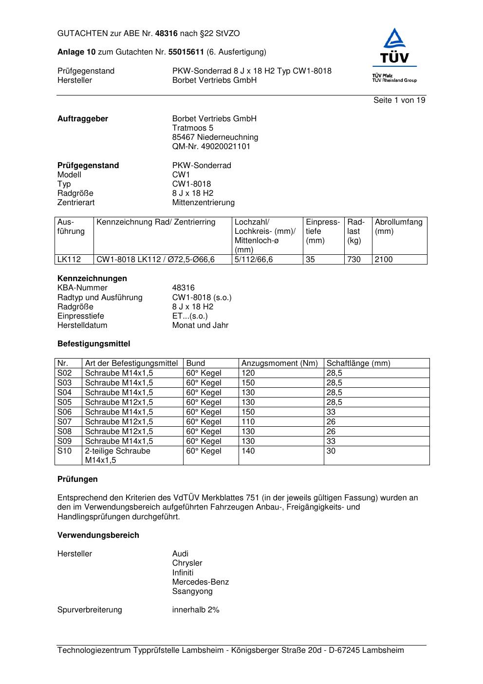 Dieses Gutachten (abe) bezieht sich auf die Alufelge Borbet CW1-80 18 in der Ausführung 8Jx18 ET 0, Mittenloch 0 mm (KBA 48316). Im PDF findest du typischerweise zulässige Reifengrößen, Auflagen/Anbauhinweise und – je nach Dokument – Hinweise zur Eintragung.