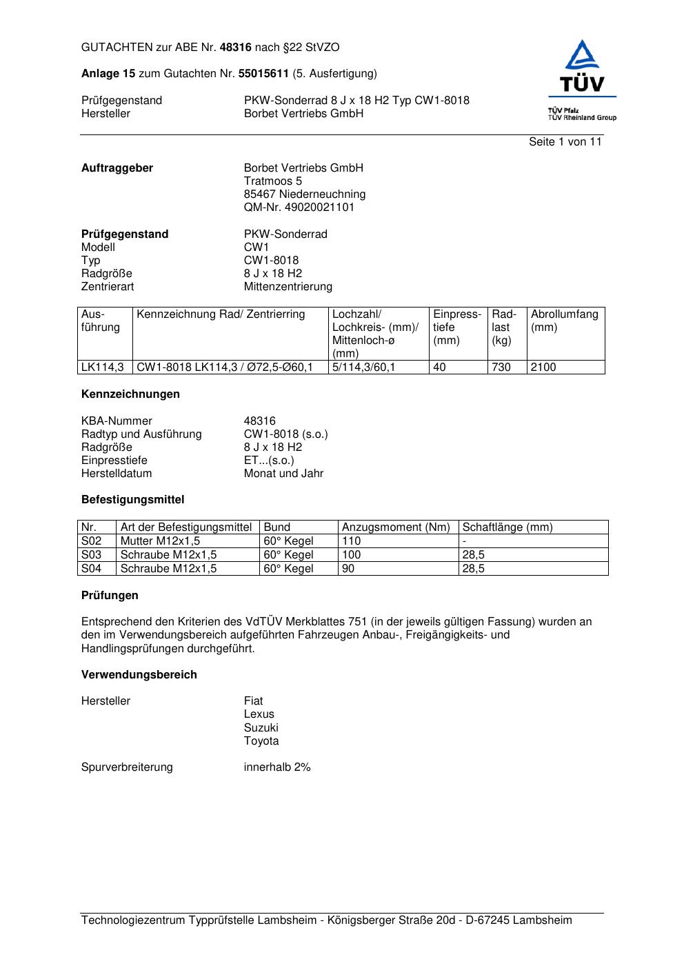 Dieses Gutachten (abe) bezieht sich auf die Alufelge Borbet CW1-80 18 in der Ausführung 8Jx18 ET 0, Mittenloch 0 mm (KBA 48316). Im PDF findest du typischerweise zulässige Reifengrößen, Auflagen/Anbauhinweise und – je nach Dokument – Hinweise zur Eintragung.