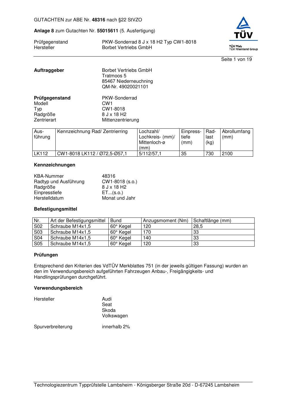 Dieses Gutachten (abe) bezieht sich auf die Alufelge Borbet CW1-80 18 in der Ausführung 8Jx18 ET 0, Mittenloch 0 mm (KBA 48316). Im PDF findest du typischerweise zulässige Reifengrößen, Auflagen/Anbauhinweise und – je nach Dokument – Hinweise zur Eintragung.