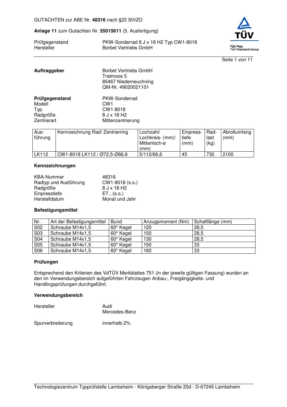 Dieses Gutachten (abe) bezieht sich auf die Alufelge Borbet CW1-80 18 in der Ausführung 8Jx18 ET 0, Mittenloch 0 mm (KBA 48316). Im PDF findest du typischerweise zulässige Reifengrößen, Auflagen/Anbauhinweise und – je nach Dokument – Hinweise zur Eintragung.