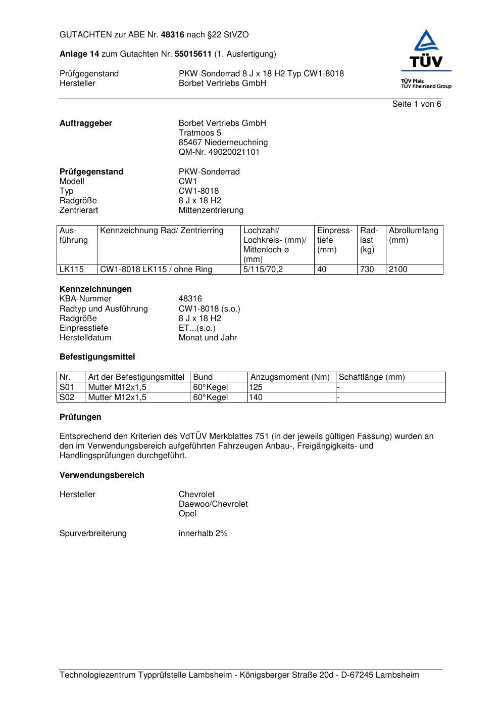 Dieses Gutachten (abe) bezieht sich auf die Alufelge Borbet CW1-80 18 in der Ausführung 8Jx18 ET 0, Mittenloch 0 mm (KBA 48316). Im PDF findest du typischerweise zulässige Reifengrößen, Auflagen/Anbauhinweise und – je nach Dokument – Hinweise zur Eintragung.