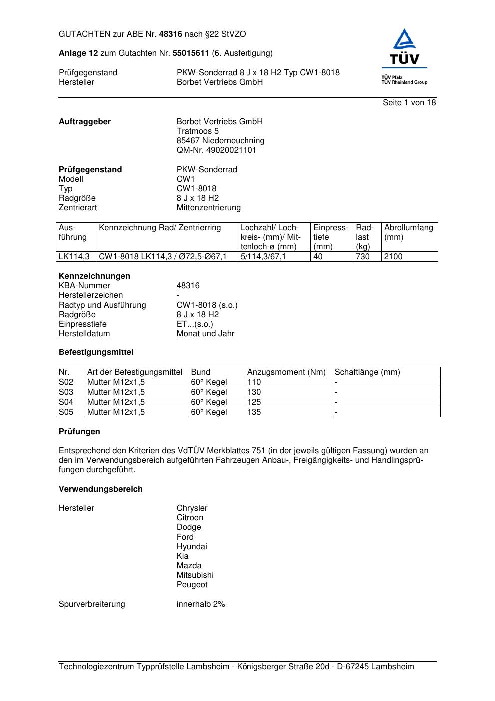 Dieses Gutachten (abe) bezieht sich auf die Alufelge Borbet CW1-80 18 in der Ausführung 8Jx18 ET 0, Mittenloch 0 mm (KBA 48316). Im PDF findest du typischerweise zulässige Reifengrößen, Auflagen/Anbauhinweise und – je nach Dokument – Hinweise zur Eintragung.