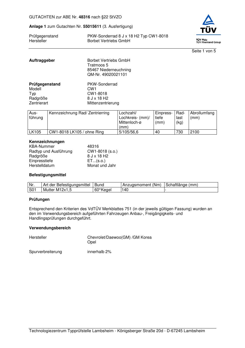 Dieses Gutachten (abe) bezieht sich auf die Alufelge Borbet CW1-80 18 in der Ausführung 8Jx18 ET 0, Mittenloch 0 mm (KBA 48316). Im PDF findest du typischerweise zulässige Reifengrößen, Auflagen/Anbauhinweise und – je nach Dokument – Hinweise zur Eintragung.