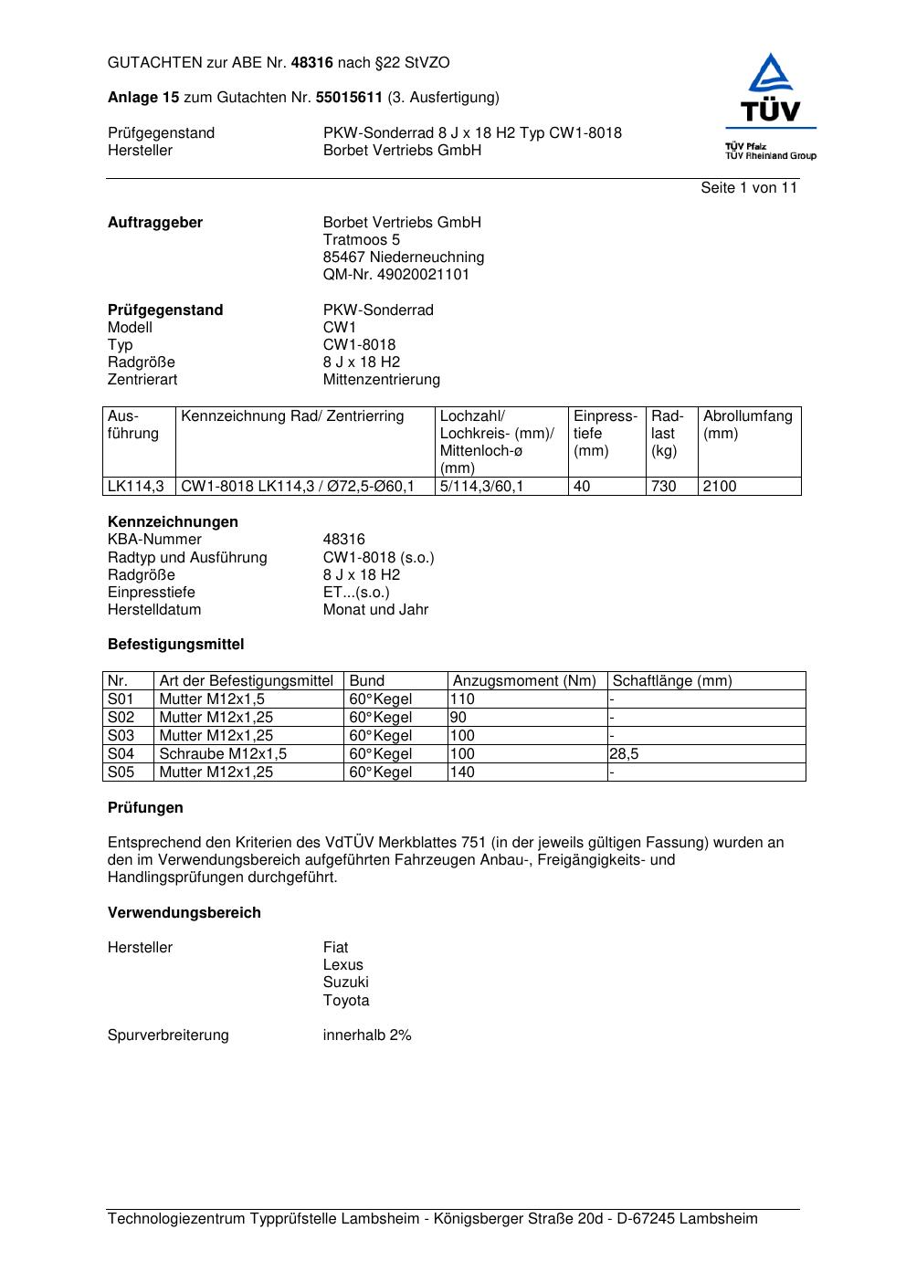 Dieses Gutachten (abe) bezieht sich auf die Alufelge Borbet CW1-80 18 in der Ausführung 8Jx18 ET 0, Mittenloch 0 mm (KBA 48316). Im PDF findest du typischerweise zulässige Reifengrößen, Auflagen/Anbauhinweise und – je nach Dokument – Hinweise zur Eintragung.