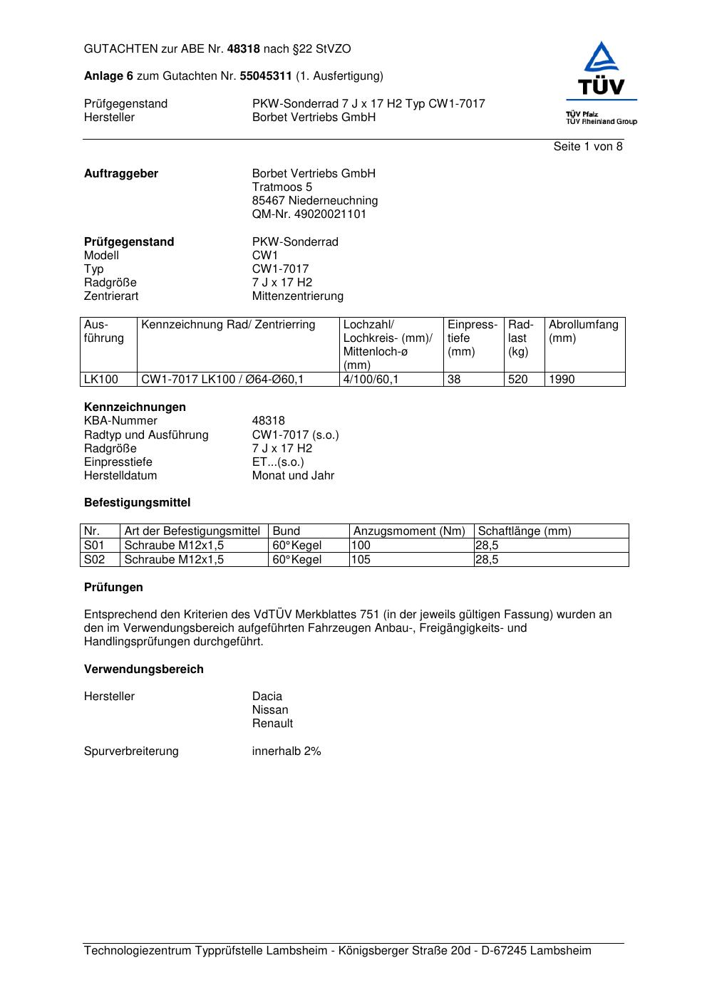 Dieses Gutachten (abe) bezieht sich auf die Alufelge Borbet CW1-70 17 in der Ausführung 7Jx17 ET 0, Mittenloch 0 mm (KBA 48318). Im PDF findest du typischerweise zulässige Reifengrößen, Auflagen/Anbauhinweise und – je nach Dokument – Hinweise zur Eintragung.