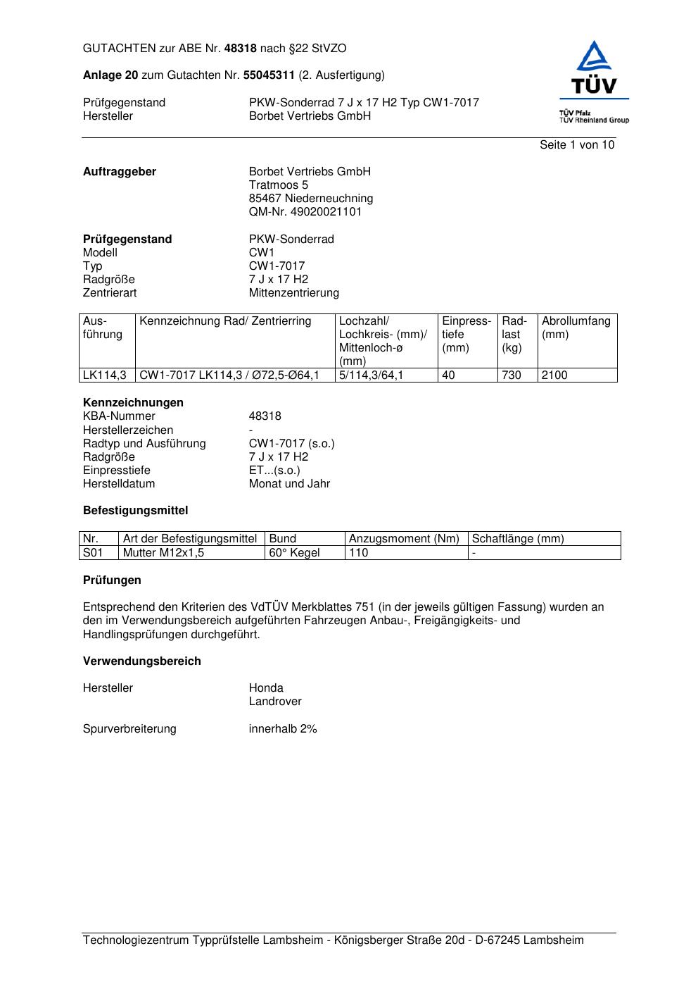 Dieses Gutachten (abe) bezieht sich auf die Alufelge Borbet CW1-70 17 in der Ausführung 7Jx17 ET 0, Mittenloch 0 mm (KBA 48318). Im PDF findest du typischerweise zulässige Reifengrößen, Auflagen/Anbauhinweise und – je nach Dokument – Hinweise zur Eintragung.