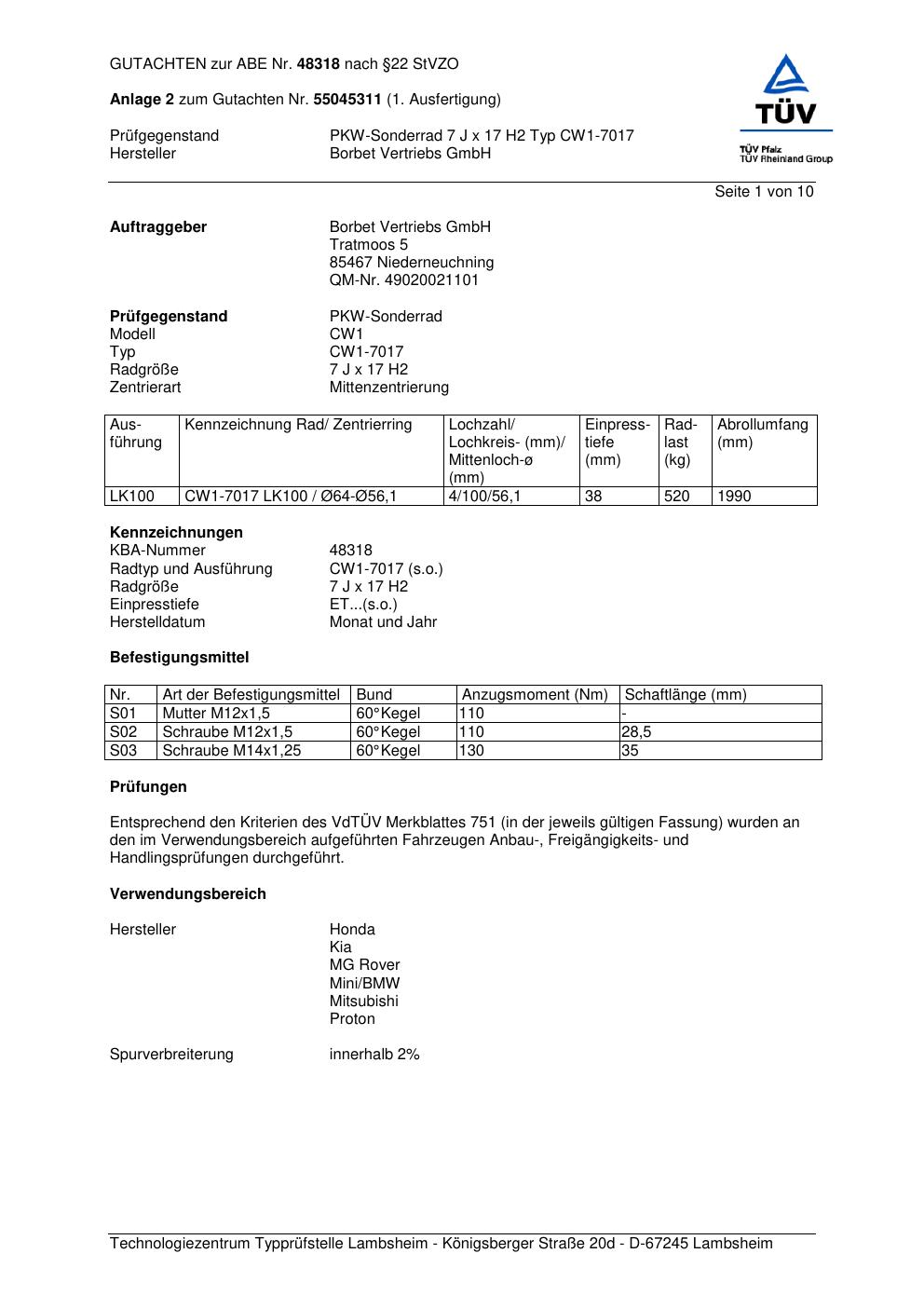 Dieses Gutachten (abe) bezieht sich auf die Alufelge Borbet CW1-70 17 in der Ausführung 7Jx17 ET 0, Mittenloch 0 mm (KBA 48318). Im PDF findest du typischerweise zulässige Reifengrößen, Auflagen/Anbauhinweise und – je nach Dokument – Hinweise zur Eintragung.