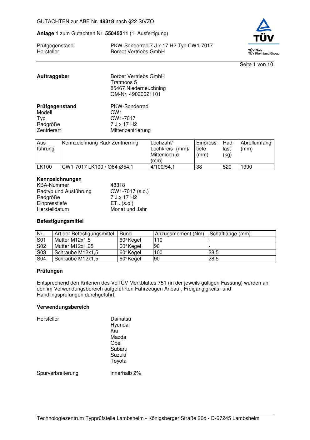 Dieses Gutachten (abe) bezieht sich auf die Alufelge Borbet CW1-70 17 in der Ausführung 7Jx17 ET 0, Mittenloch 0 mm (KBA 48318). Im PDF findest du typischerweise zulässige Reifengrößen, Auflagen/Anbauhinweise und – je nach Dokument – Hinweise zur Eintragung.