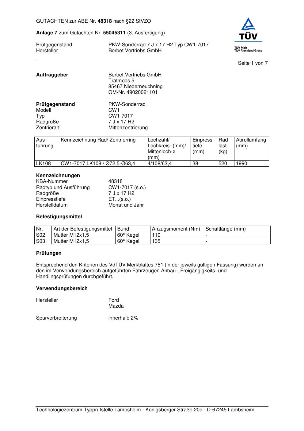 Dieses Gutachten (abe) bezieht sich auf die Alufelge Borbet CW1-70 17 in der Ausführung 7Jx17 ET 0, Mittenloch 0 mm (KBA 48318). Im PDF findest du typischerweise zulässige Reifengrößen, Auflagen/Anbauhinweise und – je nach Dokument – Hinweise zur Eintragung.