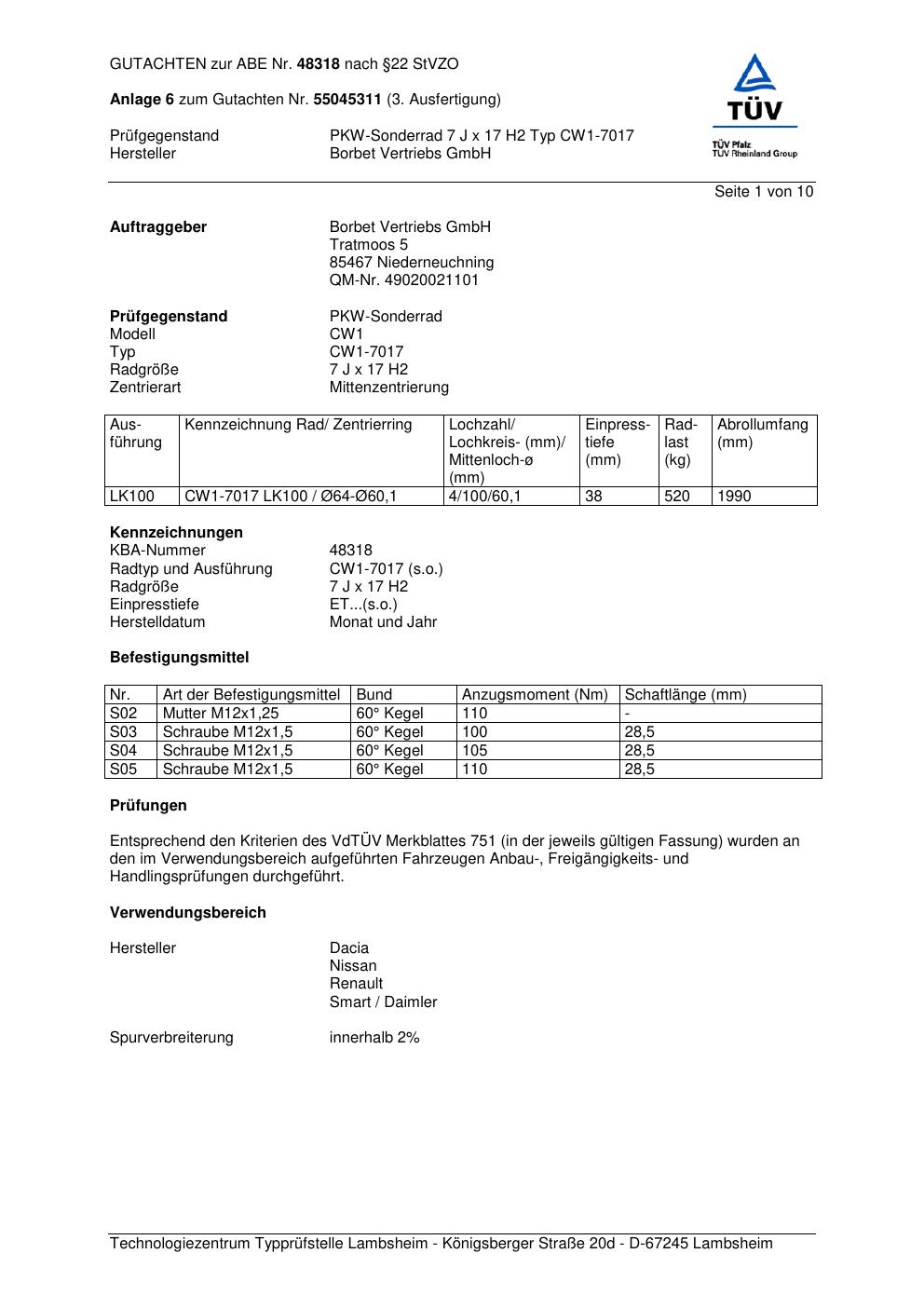 Dieses Gutachten (abe) bezieht sich auf die Alufelge Borbet CW1-70 17 in der Ausführung 7Jx17 ET 0, Mittenloch 0 mm (KBA 48318). Im PDF findest du typischerweise zulässige Reifengrößen, Auflagen/Anbauhinweise und – je nach Dokument – Hinweise zur Eintragung.