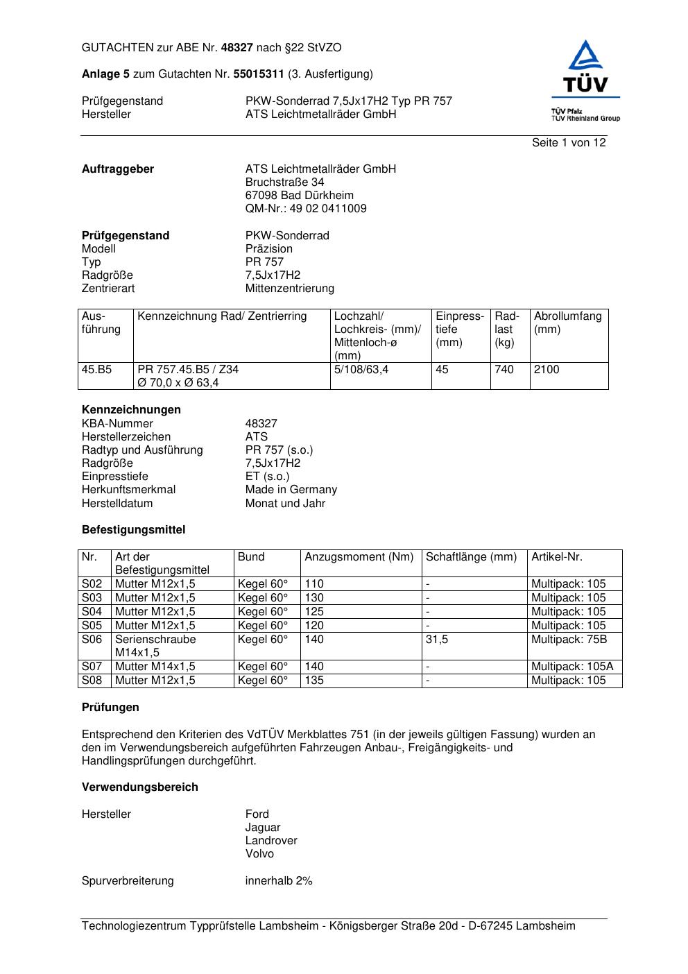 Dieses Gutachten (abe) bezieht sich auf die Alufelge ATS PR 757 in der Ausführung 7.5Jx17 ET 0, Mittenloch 0 mm (KBA 48327). Im PDF findest du typischerweise zulässige Reifengrößen, Auflagen/Anbauhinweise und – je nach Dokument – Hinweise zur Eintragung.