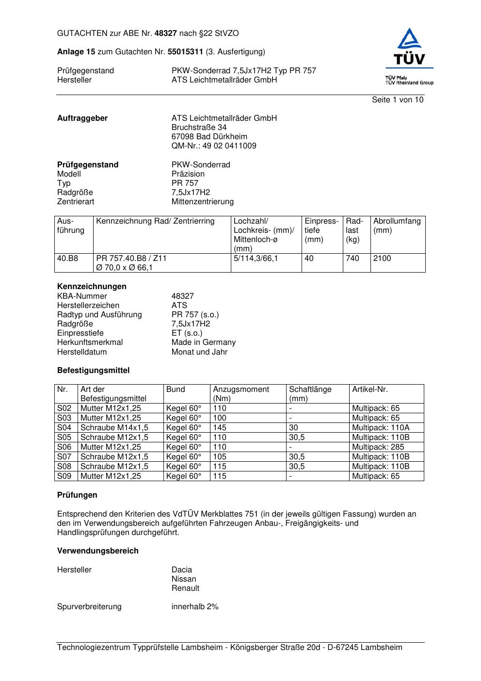 Dieses Gutachten (abe) bezieht sich auf die Alufelge ATS PR 757 in der Ausführung 7.5Jx17 ET 0, Mittenloch 0 mm (KBA 48327). Im PDF findest du typischerweise zulässige Reifengrößen, Auflagen/Anbauhinweise und – je nach Dokument – Hinweise zur Eintragung.