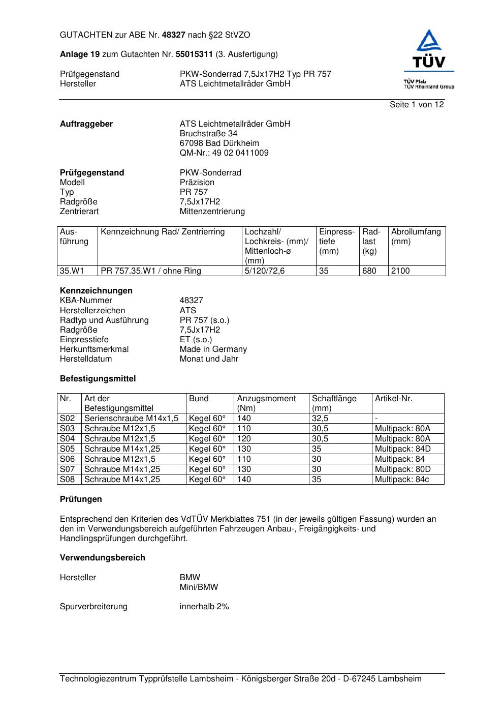 Dieses Gutachten (abe) bezieht sich auf die Alufelge ATS PR 757 in der Ausführung 7.5Jx17 ET 0, Mittenloch 0 mm (KBA 48327). Im PDF findest du typischerweise zulässige Reifengrößen, Auflagen/Anbauhinweise und – je nach Dokument – Hinweise zur Eintragung.