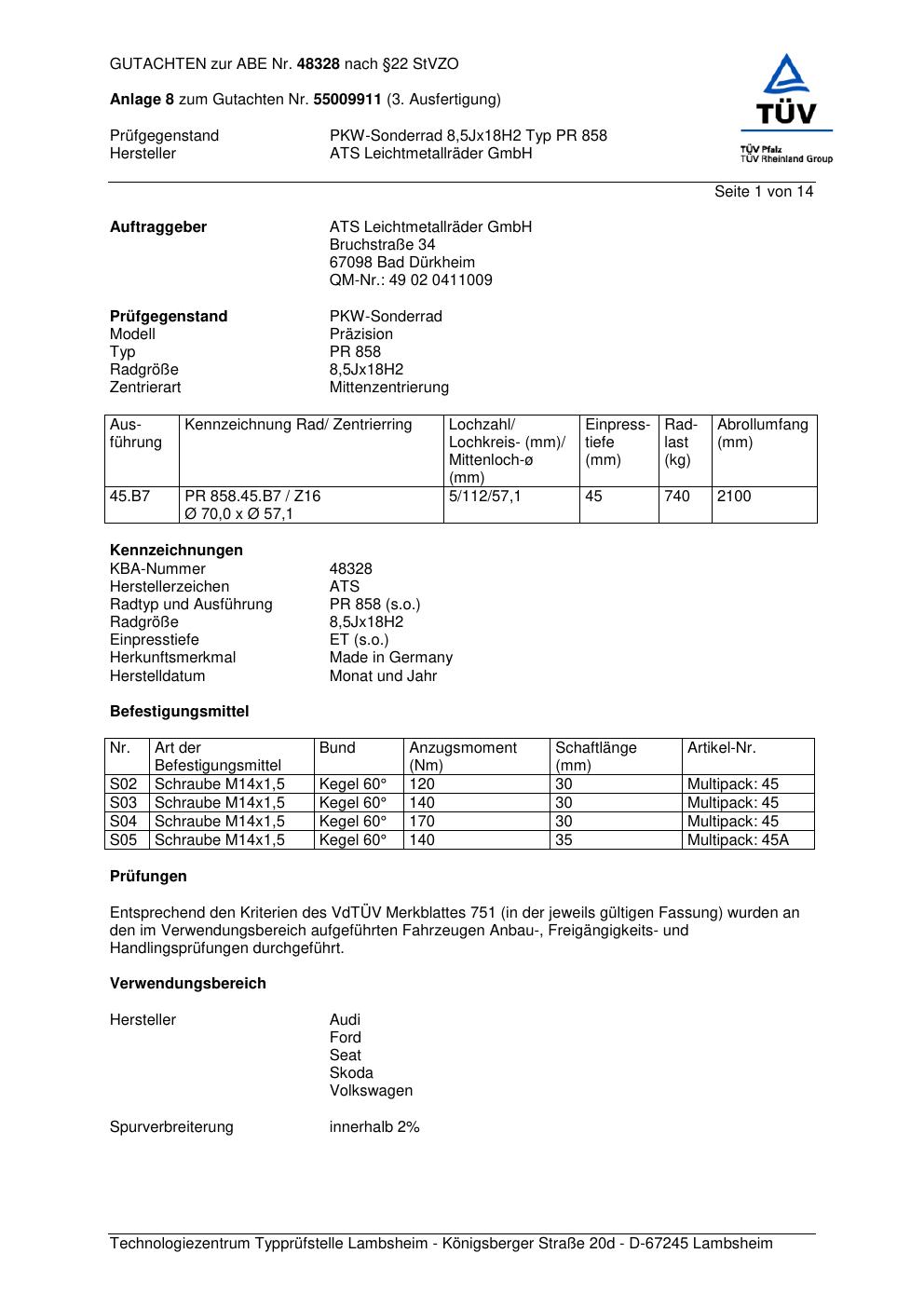 Dieses Gutachten (abe) bezieht sich auf die Alufelge ATS PR 858 in der Ausführung 8.5Jx18 ET 0, Mittenloch 0 mm (KBA 48328). Im PDF findest du typischerweise zulässige Reifengrößen, Auflagen/Anbauhinweise und – je nach Dokument – Hinweise zur Eintragung.