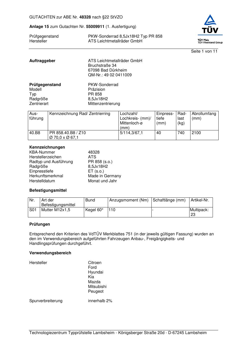 Dieses Gutachten (abe) bezieht sich auf die Alufelge ATS PR 858 in der Ausführung 8.5Jx18 ET 0, Mittenloch 0 mm (KBA 48328). Im PDF findest du typischerweise zulässige Reifengrößen, Auflagen/Anbauhinweise und – je nach Dokument – Hinweise zur Eintragung.