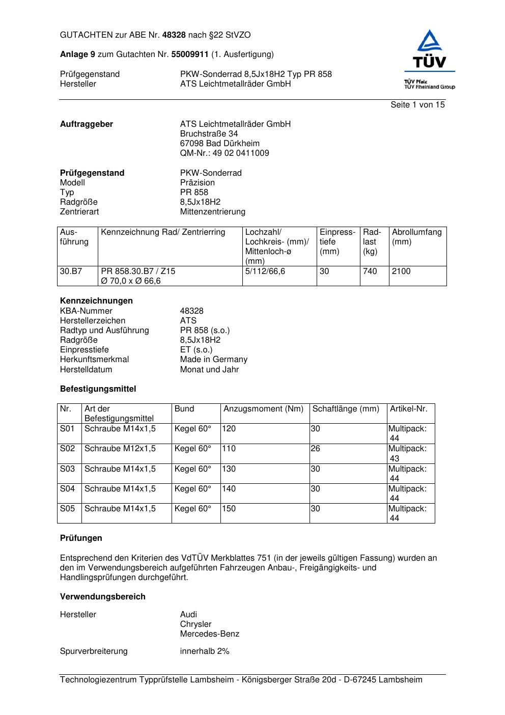 Dieses Gutachten (abe) bezieht sich auf die Alufelge ATS PR 858 in der Ausführung 8.5Jx18 ET 0, Mittenloch 0 mm (KBA 48328). Im PDF findest du typischerweise zulässige Reifengrößen, Auflagen/Anbauhinweise und – je nach Dokument – Hinweise zur Eintragung.
