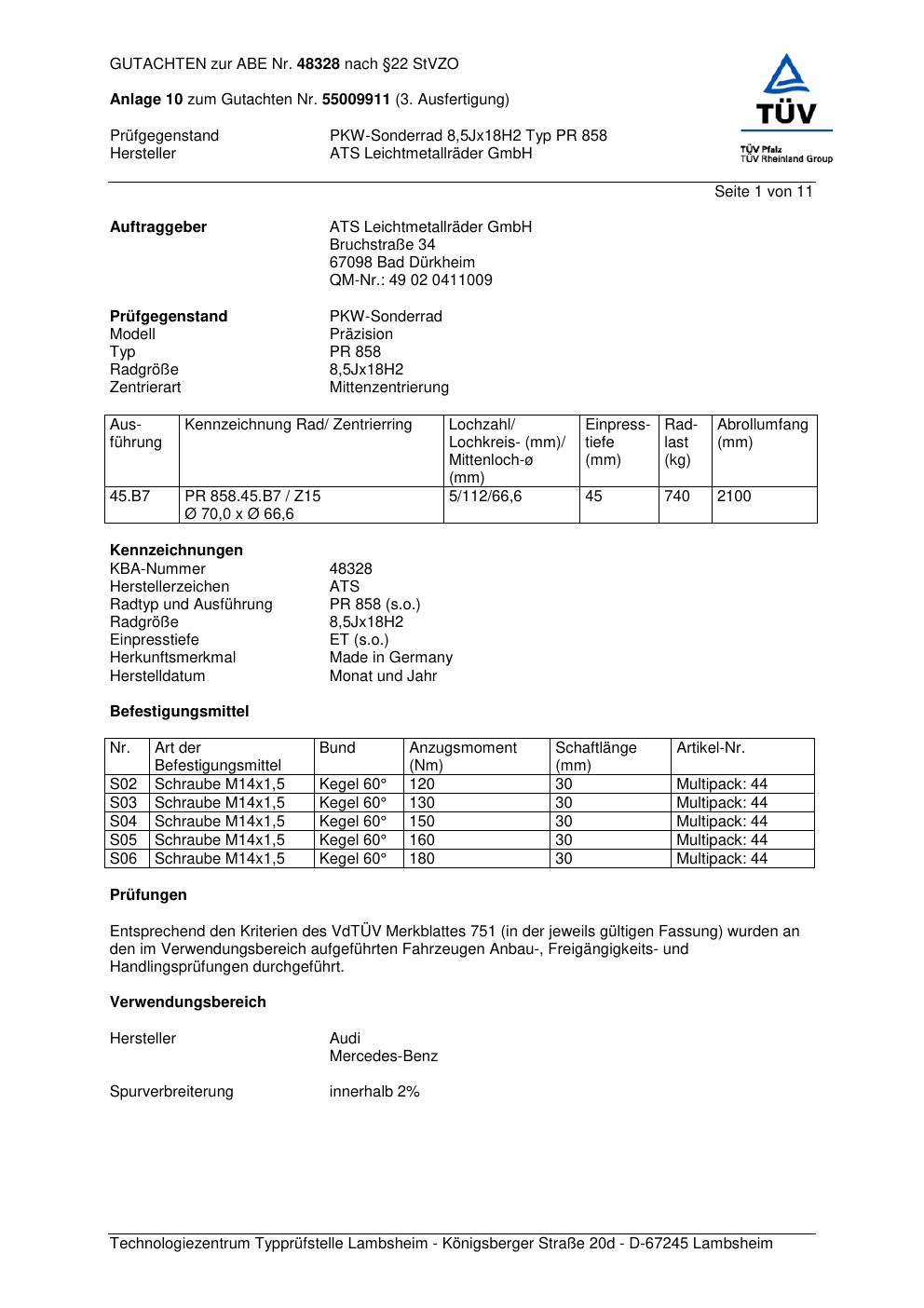 Dieses Gutachten (abe) bezieht sich auf die Alufelge ATS PR 858 in der Ausführung 8.5Jx18 ET 0, Mittenloch 0 mm (KBA 48328). Im PDF findest du typischerweise zulässige Reifengrößen, Auflagen/Anbauhinweise und – je nach Dokument – Hinweise zur Eintragung.
