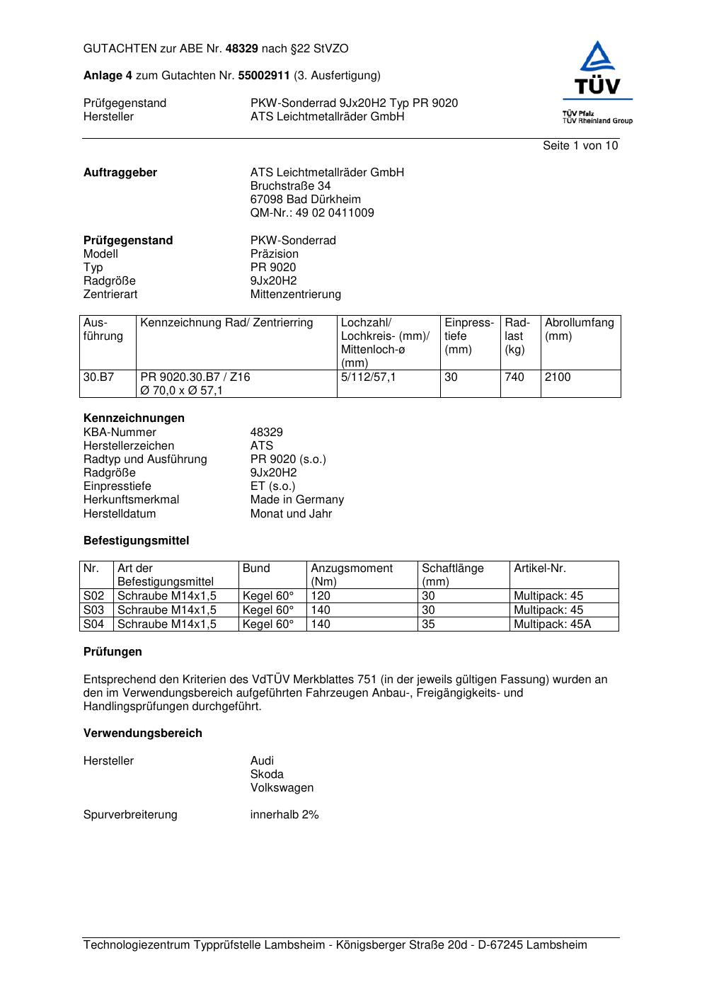 Felgengutachten / abe für Alufelgen ATS PR 9020 (9Jx2 ET 0, Mittenloch 0 mm) mit KBA 48329 (Zertifikatsnummer 48329). Hier kostenlos als PDF herunterladen. Der Download-Link ist 24 Stunden gültig und kann bis zu zwei Mal verwendet werden.