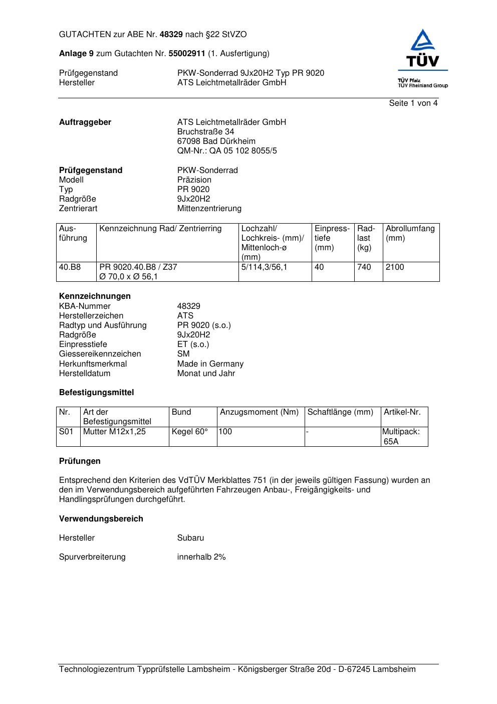 Dieses Gutachten (abe) bezieht sich auf die Alufelge ATS PR 9020 in der Ausführung 9Jx2 ET 0, Mittenloch 0 mm (KBA 48329). Im PDF findest du typischerweise zulässige Reifengrößen, Auflagen/Anbauhinweise und – je nach Dokument – Hinweise zur Eintragung.