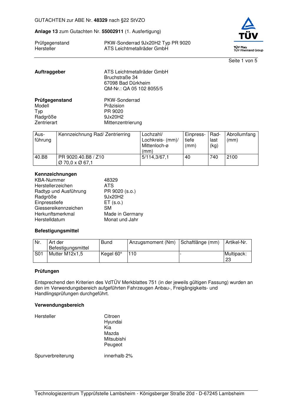 Dieses Gutachten (abe) bezieht sich auf die Alufelge ATS PR 9020 in der Ausführung 9Jx2 ET 0, Mittenloch 0 mm (KBA 48329). Im PDF findest du typischerweise zulässige Reifengrößen, Auflagen/Anbauhinweise und – je nach Dokument – Hinweise zur Eintragung.