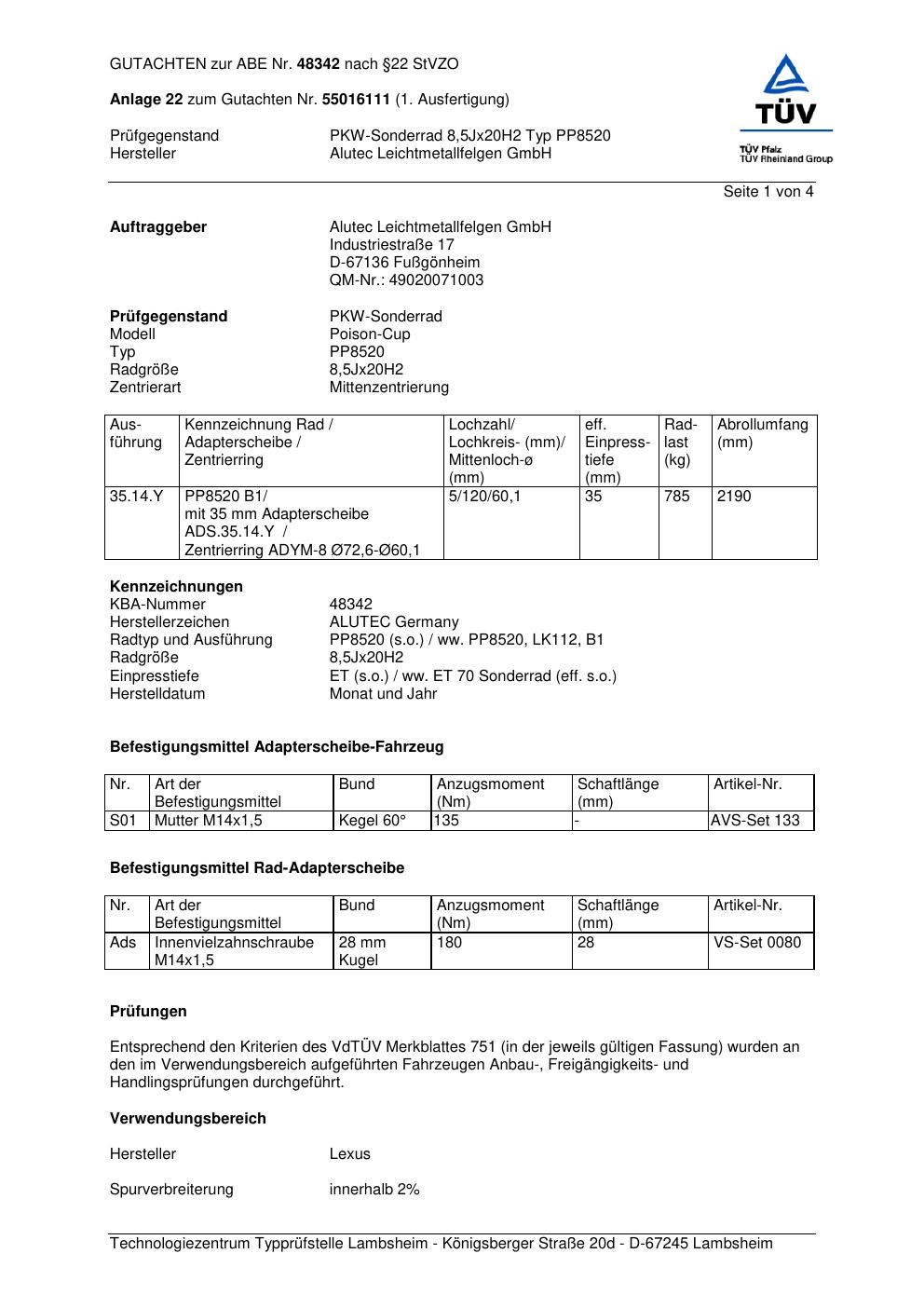 Dieses Gutachten (abe) bezieht sich auf die Alufelge ALUTEC PP8520 in der Ausführung 8.5Jx2 ET 0, Mittenloch 0 mm (KBA 48342). Im PDF findest du typischerweise zulässige Reifengrößen, Auflagen/Anbauhinweise und – je nach Dokument – Hinweise zur Eintragung.