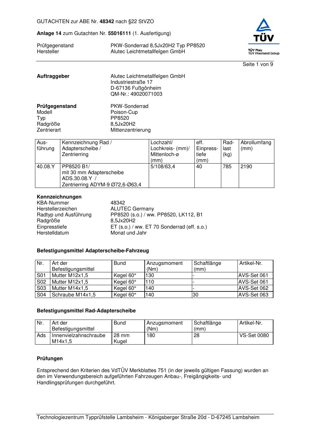 Dieses Gutachten (abe) bezieht sich auf die Alufelge ALUTEC PP8520 in der Ausführung 8.5Jx2 ET 0, Mittenloch 0 mm (KBA 48342). Im PDF findest du typischerweise zulässige Reifengrößen, Auflagen/Anbauhinweise und – je nach Dokument – Hinweise zur Eintragung.